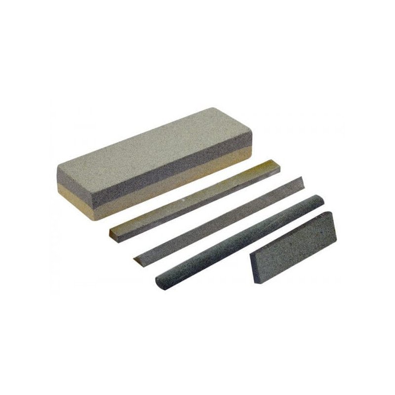 5 Piece Silicon Carbide Sharpening Stones 150 x 50 x 25mm With combination fine and medium sharpening surfaces. Triangle, flat and half round 150 x 10mm stone. A stubby stone 75 x 25mm included. Used for sharpening multiple items.