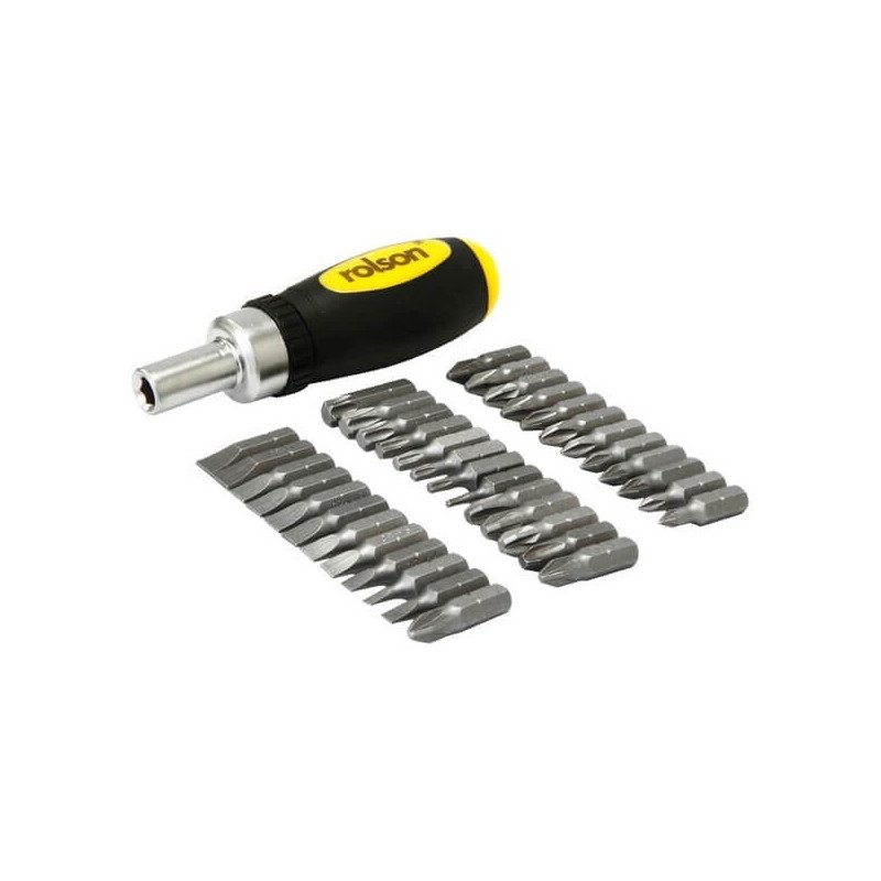 38 Piece Stubby Ratchet Screwdriver & Bit Set - Consists of stubby ratchet screwdriver and 36pc x 25mm screwdriver bits. Sizes include Star T8, T10, T15, T20, T25, T30, T35, T40.Cross point PZ0, PZ1 x 2pcs, PZ2 x 4pcs, PZ3 x 2pcs PH0, PH1 x 2pcs, PH2 x 4pcs, PH3 x 2pcs. Slot 3, 4, 5 x 2pcs, 6 x 4pcs, 7mm x 2pcs. Supplied in plastic storage case.